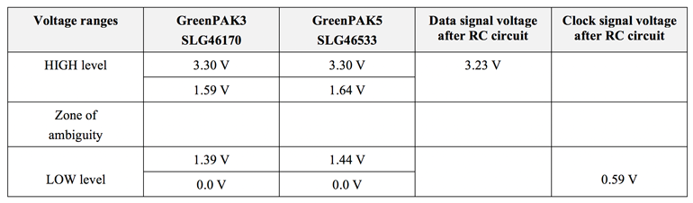 通過(guò)RC元件后收到的數(shù)據(jù)信號(hào)電壓必須在邏輯一個(gè)電壓的一定范圍內(nèi)(圖2的綠色區(qū)域)。 時(shí)鐘信號(hào)電壓不應(yīng)通過(guò)RC元件,也不應(yīng)超出邏輯零電壓范圍(圖2的紅色區(qū)域)。  它們之間有一個(gè)模糊區(qū)域,完全可能存在錯(cuò)誤狀態(tài)。因此,必須選擇電容器的容量和電阻器的電阻,以使所有充電/放電瞬態(tài)電壓值都不會(huì)落入該區(qū)域。這樣做的方法如下: