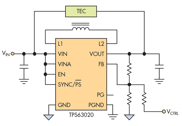 1.顯示的是一個(gè)簡(jiǎn)單電路(TI參考設(shè)計(jì)PMP9759)的示例,該電路雙向驅(qū)動(dòng)流過(guò)TEC的電流。單芯片降壓-升壓轉(zhuǎn)換器需要最少的組件數(shù)量。