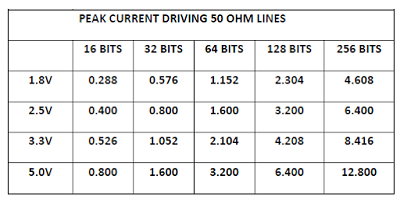 可以為任何邏輯系列計(jì)算圖2所示的電流。例如,如果邏輯系列為3.3V CMOS,則每條線的峰值電流約為33 mA。如果使用這種邏輯形式創(chuàng)建數(shù)據(jù)總線,則當(dāng)所有位同時(shí)從0轉(zhuǎn)換到1時(shí),總線所需的峰值電流為總線中位數(shù)的33 mA倍。表1列出了幾個(gè)邏輯系列的峰值電流(以安培為單位,在各種總線寬度下)。