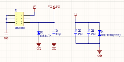 除了電源濾波之外,我還為每個輸入添加了一些基本的ESD保護。如果像許多貿易展覽會場館一樣跪在地毯上,準備好相機準備插入設備時會積聚靜電,這很容易導致ESD事件損壞相當昂貴的設備。通過在輸入端和穩(wěn)壓器板上提供ESD保護,我們應該為攝像機提供相當高的保護等級。我在主電源板上使用的5v線路使用的是相同的0402尺寸TVS二極管TI TPD1E10B06QDPYRQ1。這些雖然很小,但具有汽車認證資格,并且可能能夠在中高濕度條件下處理海平面上的ESD事件。