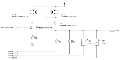該設計將Q1-Q3晶體管與R1電阻結合使用,以形成一個恒流源,該源使用2.5V ADC基準電壓源提供約1mA的電流(見圖)。當相應的GPIO引腳被驅動為低電平時,校準電阻R4和R5以及RT1和RT2 RTD傳感器可以吸收該電流。不用時,GPIO引腳為三態(tài)。在ADC輸出端測量電壓。