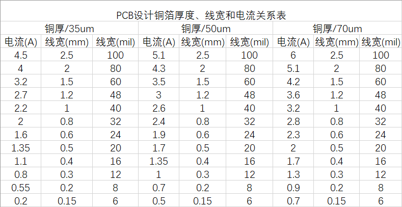 PCB設(shè)計中載流能力取決于線寬、線厚、容許升溫,下列的銅箔厚度、線寬、電流關(guān)系表是根據(jù)公式計算得來,可以直接使用,其中銅箔厚度分為35um、50um、70um(um單位:微米),大家在進(jìn)行PCB設(shè)計的時候可以直接參考,直接上干貨